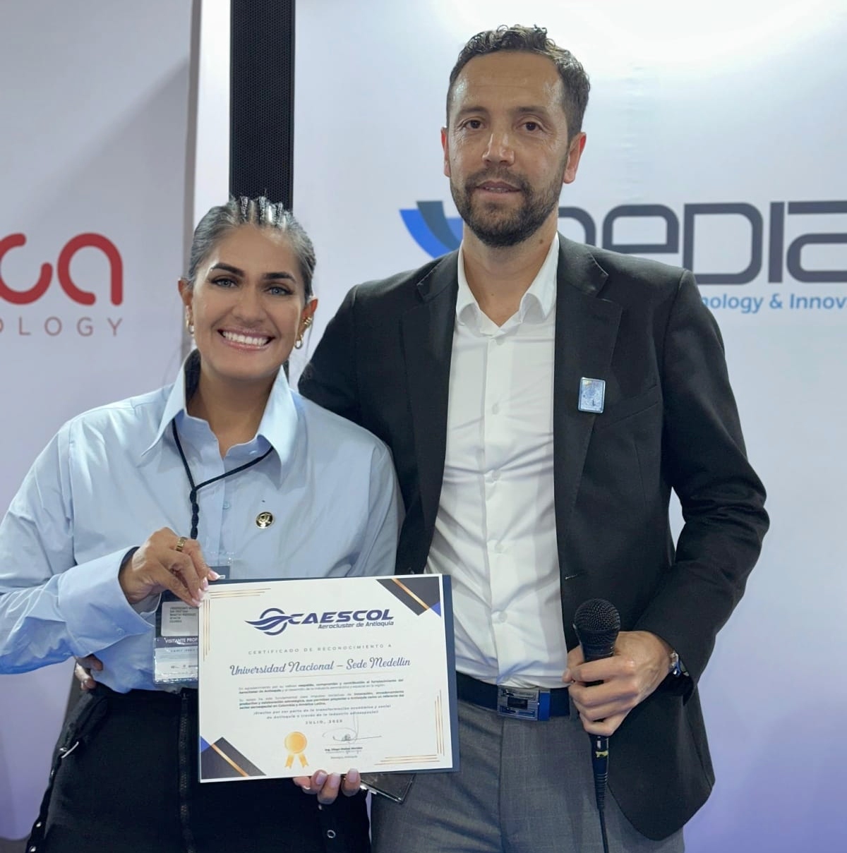El pasado viernes 11 de julio, en la Feria Internacional Aeronáutica y Espacial F-AIR 2025, la Facultad de Minas de la Universidad Nacional de Colombia Sede Medellín y el Clúster Aeroespacial Colombiano —CAESCOL— firmaron un Convenio Marco de Cooperación para unir sus capacidades científicas e industriales por el ecosistema aeroespacial del país. Esta alianza busca la creación de un centro de innovación que permitirá ofrecer servicios tecnológicos y de investigación aplicada y facilitar la transferencia de conocimiento.