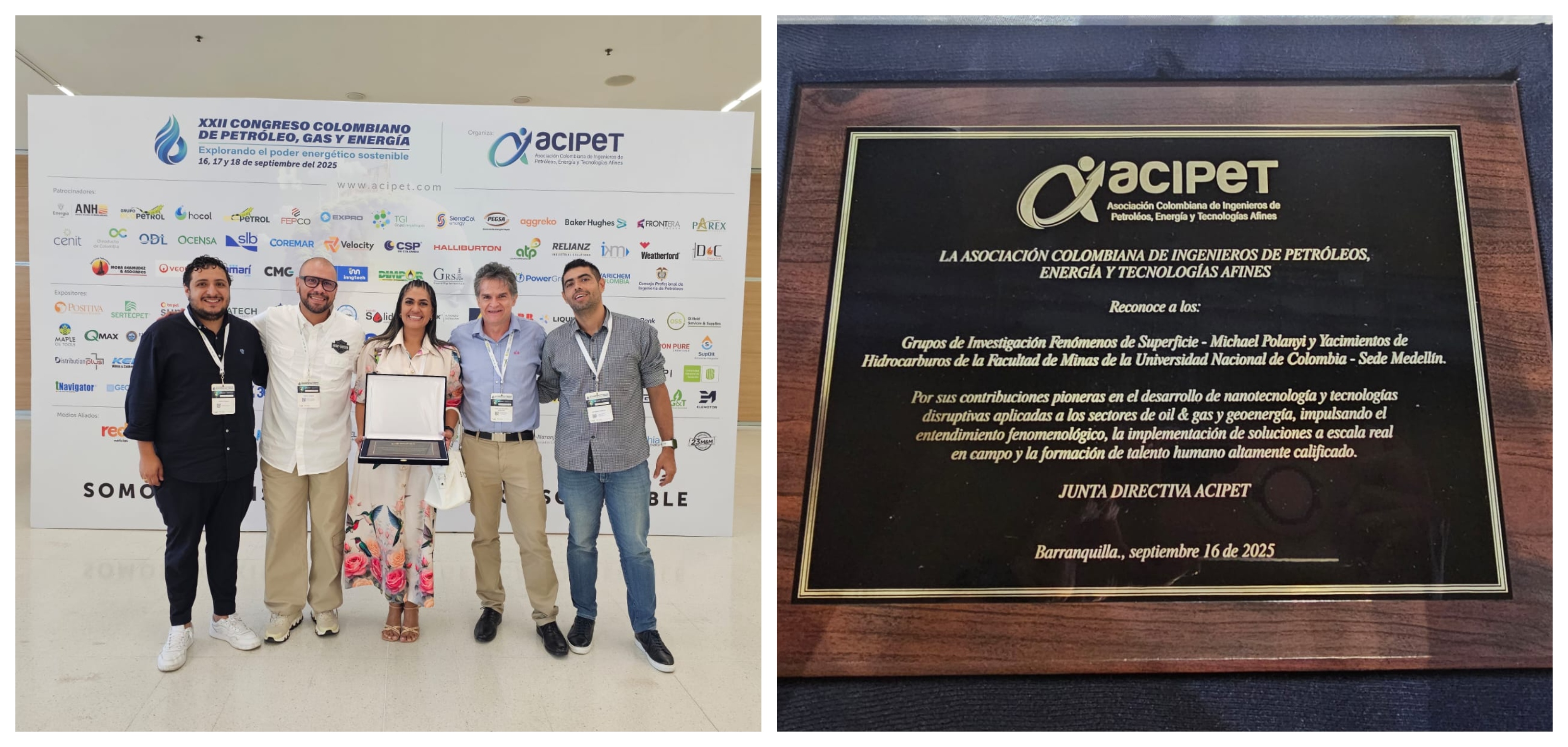 La Facultad de Minas recibió tres premios por parte de la Asociación Colombiana de Ingenieros de Petróleos, Energía y Tecnologías Afines —ACIPET—, en manos de 33 integrantes de la Facultad —docentes, estudiantes y egresados— quedaron estos galardones que enaltecen la implementación de soluciones a escala real en campo y la formación de talento humano altamente calificado. El primero fue para los grupos de investigación Fenómenos de Superficie –Michael Polanyi– y Yacimientos de Hidrocarburos por sus contribuciones a la nanotecnología y otras tecnologías aplicadas a los sectores de oil & gas y geoenergía.